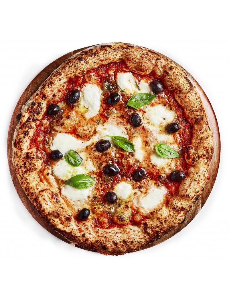 Sauce tomate, mozza, mozzarella di bufala, olives noires et basilic