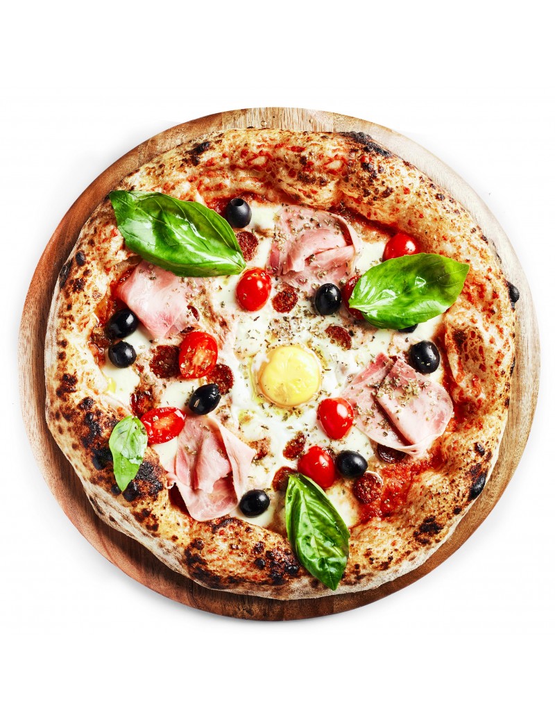Sauce tomate, mozzarella, merguez du boucher, jambon de dinde et oeuf