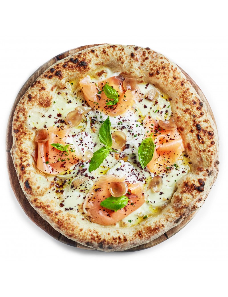 Crème fraîche, mozza, stracciatella, saumon fumé, oignons caramélisés, citron, persillade et filet d'huile d'olive extra vierge