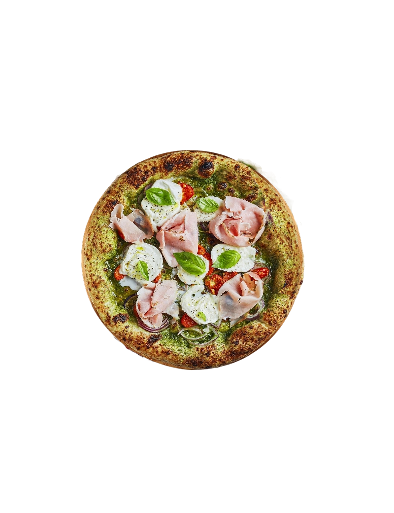 Base pesto, mozza, jambon de dinde cuit, oignons, tomates cerises, mozza di bufala campana, origan, huile d'olive extra vierge