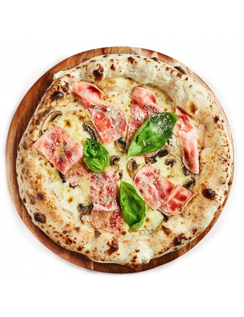 Créme fraîche, mozzarella, jambon de dinde, champignon frais, parmesan et persillade