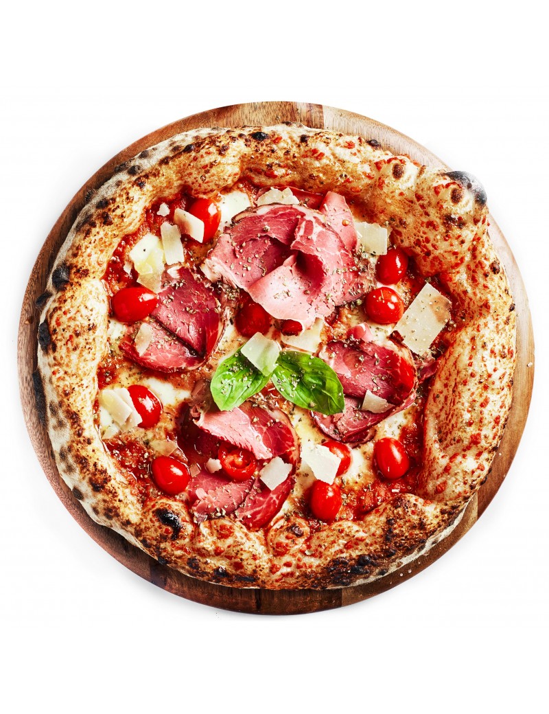 Sauce tomate, mozzarella, tranches de boeuf fumé, Grana Padano, tomates cerises