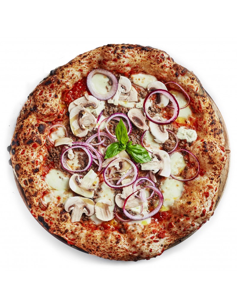 Sauce tomate, mozzarella, viande de boeuf hachée, champignons, oignons rouges et boursin
